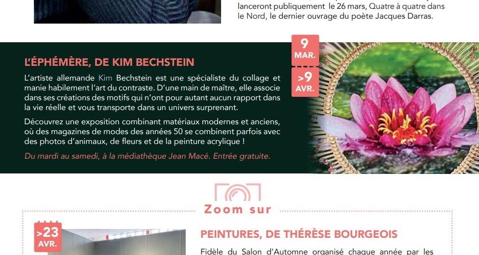 Découvrez une exposition combinant matériaux modernes et anciens, où des magazines de modes des années 50 se combinent parfois avec des photos d’animaux, de fleurs et de la peinture acrylique !